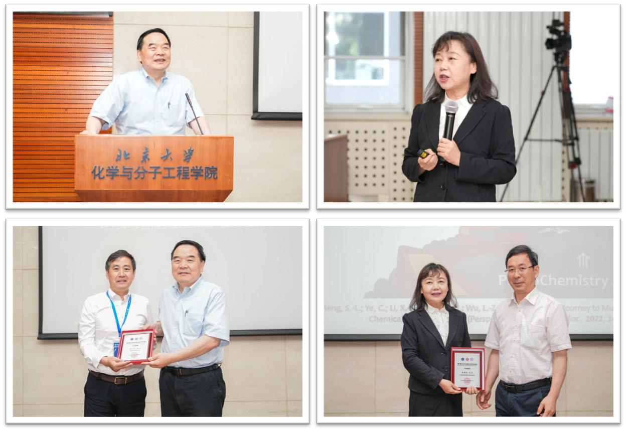 包信和院士在大会报告中分享了自己年轻时的博士后经历,鼓励青年学者面对科学难题,坚定成功信念,勇于迎难而上。包信和院士以《碳中和背景下能源化学的机遇和挑战》为题,提出实现“碳中和”是产业结构调整和能源结构变革是必由之路,是一场广泛而深刻的经济社会变革。他从化石资源优化利用、可再生能源规模化利用、氢能和氢能的应用三个方面深入探讨了实现“碳中和”的创新路径。吴骊珠院士作题为《人工光合作用》的报告,介绍了光合作用、光与物质相互作用的科学史,梳理了世界在光催化领域的一系列里程碑式研究,强调了在能源短缺和环境污染的双重倒逼下,氢能被纳入各国科学界的重点突破领域。吴骊珠院士通过模拟生物氢化酶的催化活性中心,在不断优化分子结构设计后实现了太阳能光驱动人工模拟氢化酶的高效产氢,并分析光催化过程的反应机理、光催化在合成维生素、苯酚和苯胺以及合成氨等工业领域的未来应用前景,为与会师生详细展示了光催化的魅力及发展潜力。北大化学学院的党委书记裴坚教授、中科院化学所所长张德清研究员分别为两位大会报告人颁发“第3届分子科学博士后学术年会大会报告”证书。